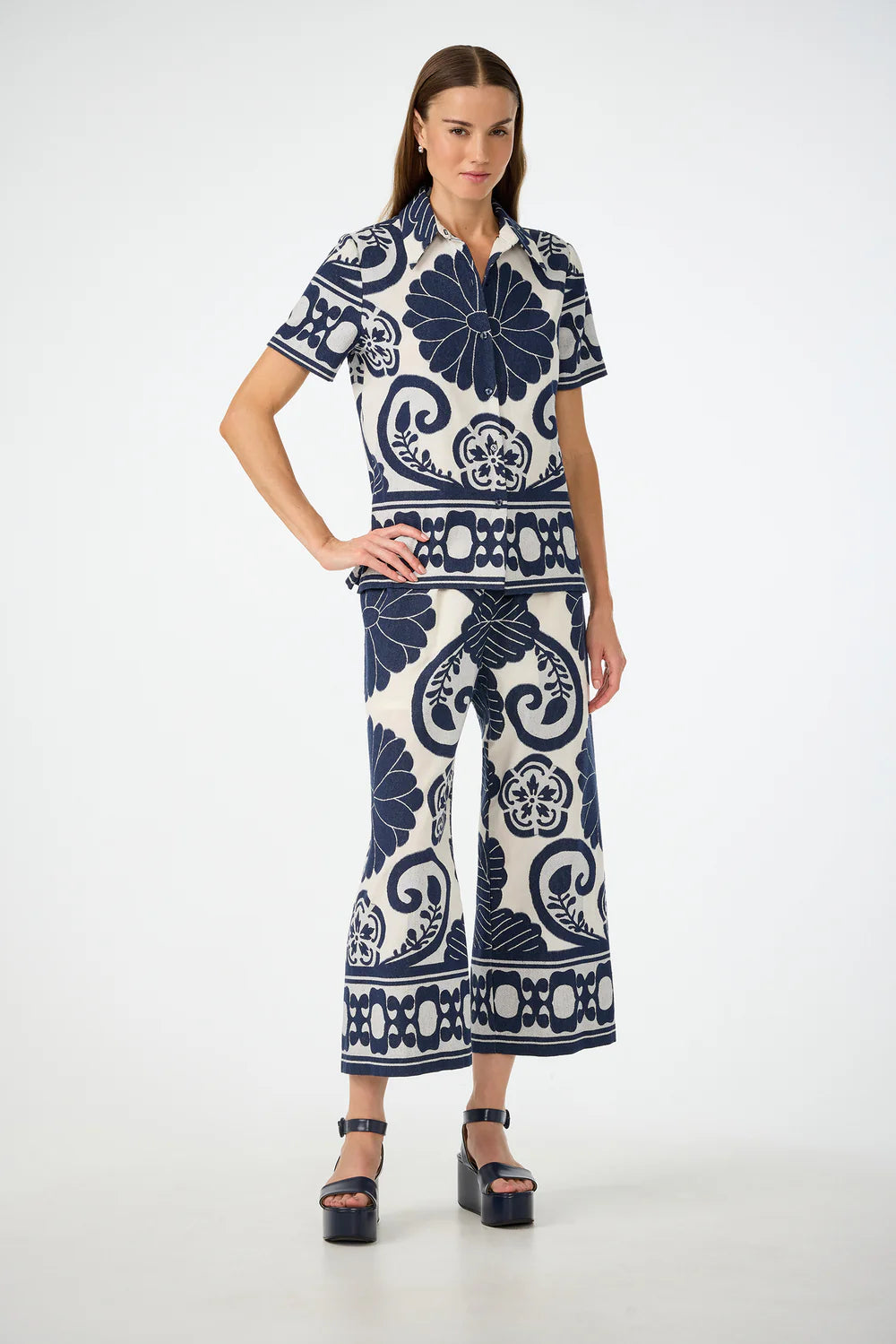Whether you're getting away or just getting out for the afternoon, this fresh button-front top will elevate your look. This short-sleeved top is made of our breathable cotton-viscose blend with a Whitewash and Sumi Blue print. Pair this bold top with our matching pants for a complete look.