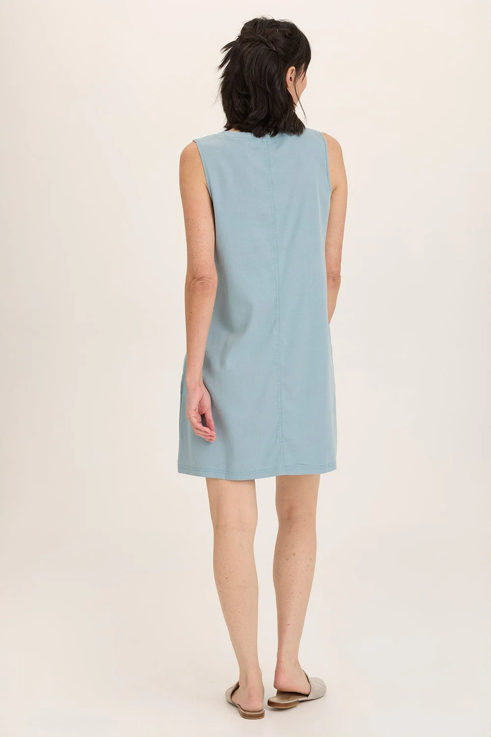 A sweet a-line shift mini dress with large pockets at the hips and a drawstring neckline.