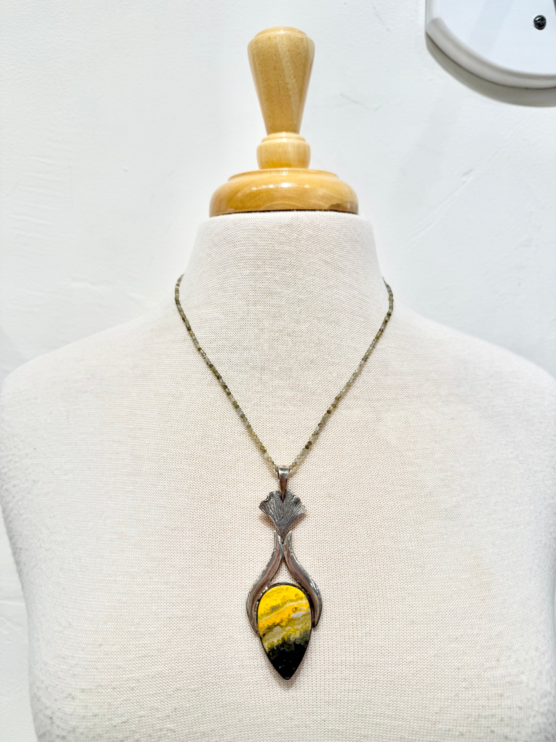 Transform your look with this stunning Bumblebee Jasper pendant in sterling silver. The vibrant colors and unique patterns of Bumblebee Jasper make this necklace a one-of-a-kind piece. The bead strand adds a touch of elegance, making it a versatile accessory for any occasion. Elevate your style with the beauty of Bumblebee Jasper by Elysium.