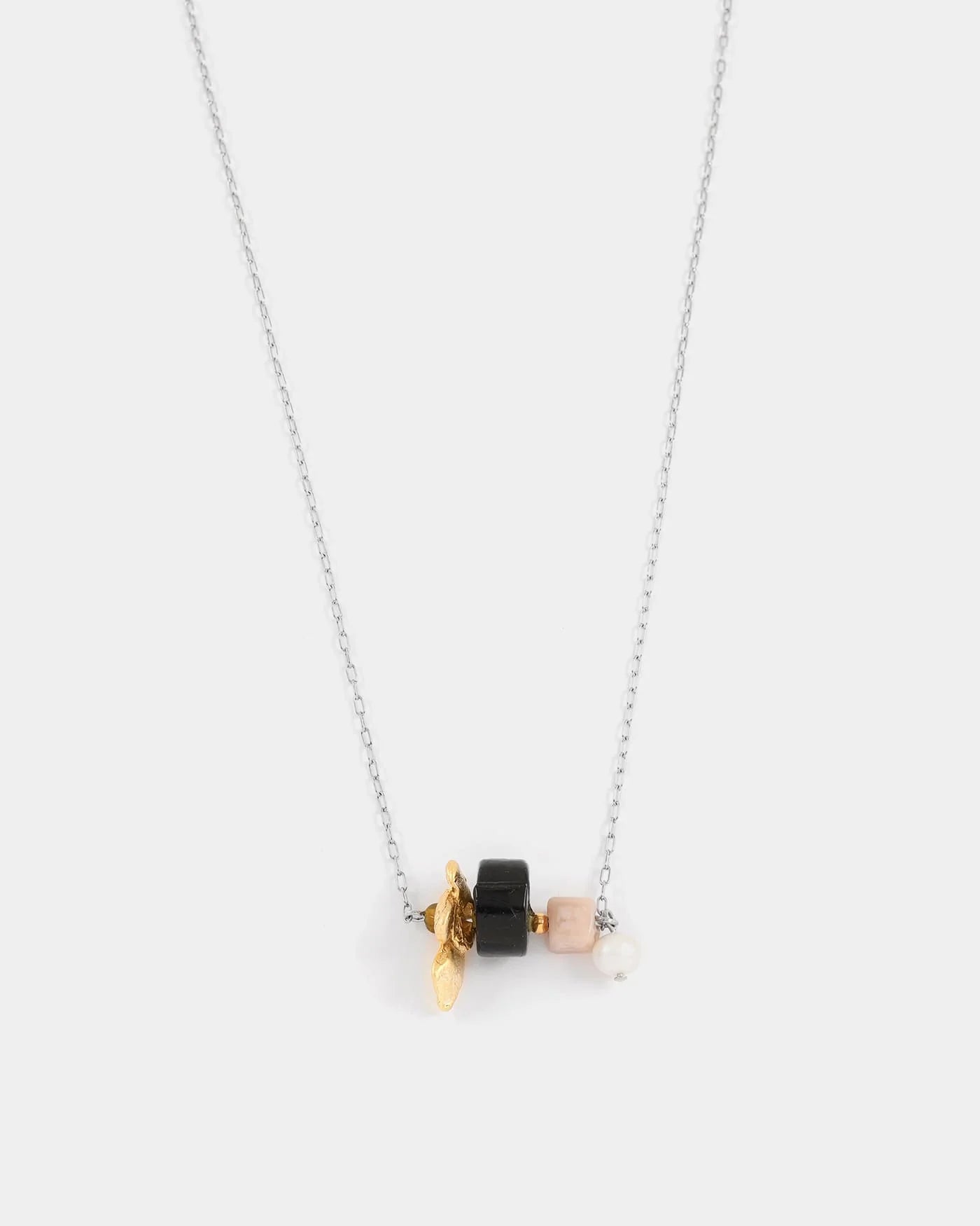 The Cassiopee short necklace traces a delicate line to the heart, where materials and emotions unite. Suspended from a fine stainless steel chain, its central elementsâ€â€a natural or 22-carat gold-plated pewter pendant and colored glass beadsâ€â€create a discreet, controlled sparkle. A slightly off-center freshwater pearl glides like an unexpected breath. A delicate piece, where harmony spreads throughout the neck. Raw pewter or 22-carat gold-plated.