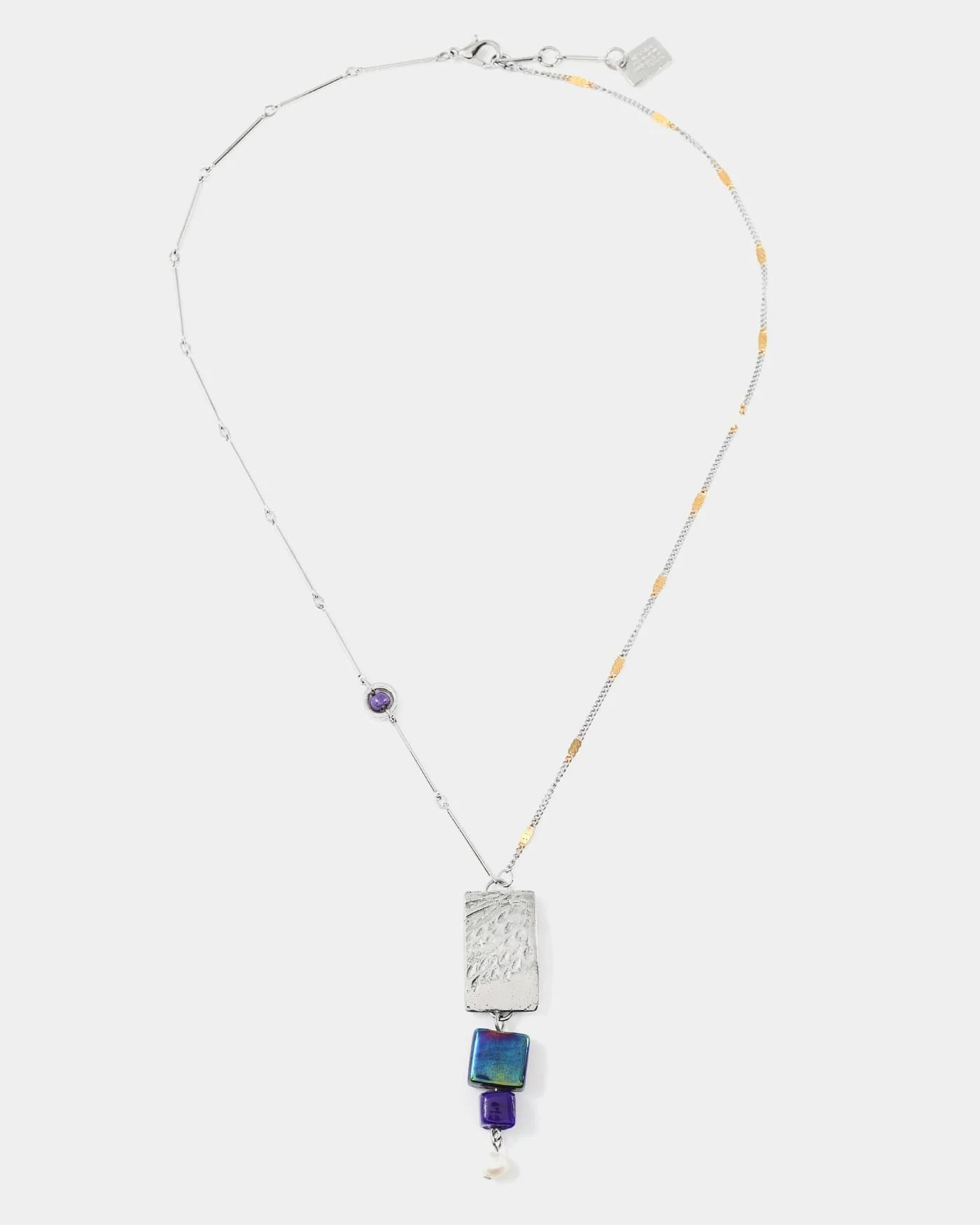 The Eris necklace draws a bold vertical line, balancing structure and movement. At its center, a textured fragment of natural or 22K gold-plated pewter anchors a colored glass tassel made of two stacked prisms. A delicate freshwater pearl softens the composition with grace. Higher up on the stainless steel chain, a ringed glass bead adds a discreet, almost secret detail. A structured design that catches the eyeâ€â€Âquietly, but with intention.