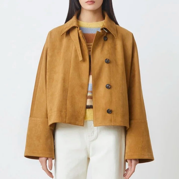 The Eloiz Jacket by Suncoo has a high collar with buckled fastener, buttoned closing under the placket, oversized sleeves and is made from recycled polyester