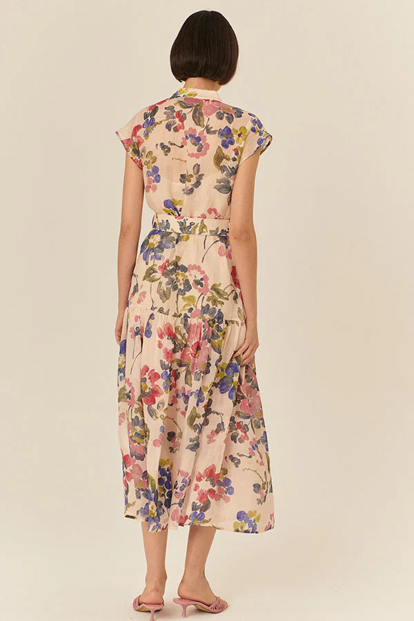 Meet Evelyn  where timeless elegance meets joyful femininity. This graceful midi dress features a soft beige base brought to life with vibrant, colorful florals. The button-up bodice is finished with a dainty collar, adding just the right touch of structure.