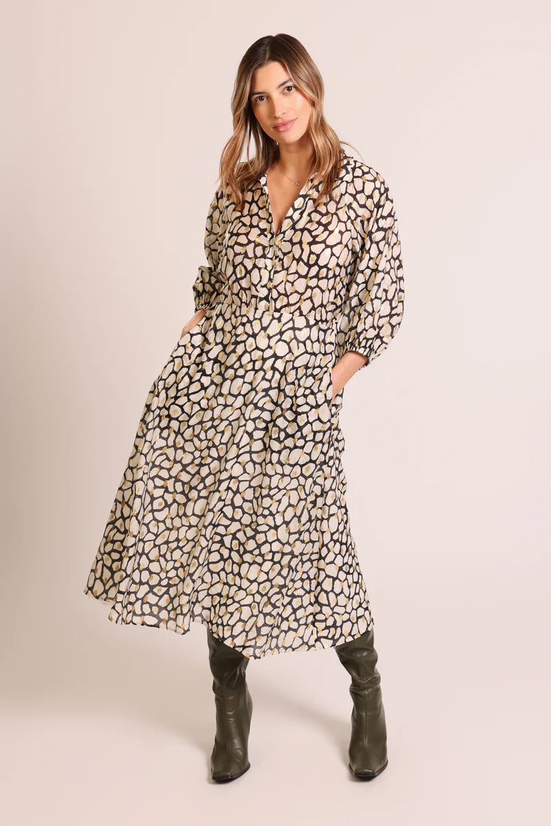 This midi dress features a flattering V-neck shirt collar and comfortable 3/4 sleeves with elasticated cuffs for ease of movement. The elasticated back waistband ensures a perfect fit, while practical side pockets add convenience. Made from a soft blend of 77% viscose and 23% nylon with a 100% viscose lining, it offers breathable comfort throughout the day. Ideal for both casual and smart occasions, this dress combines style and functionality effortlessly.