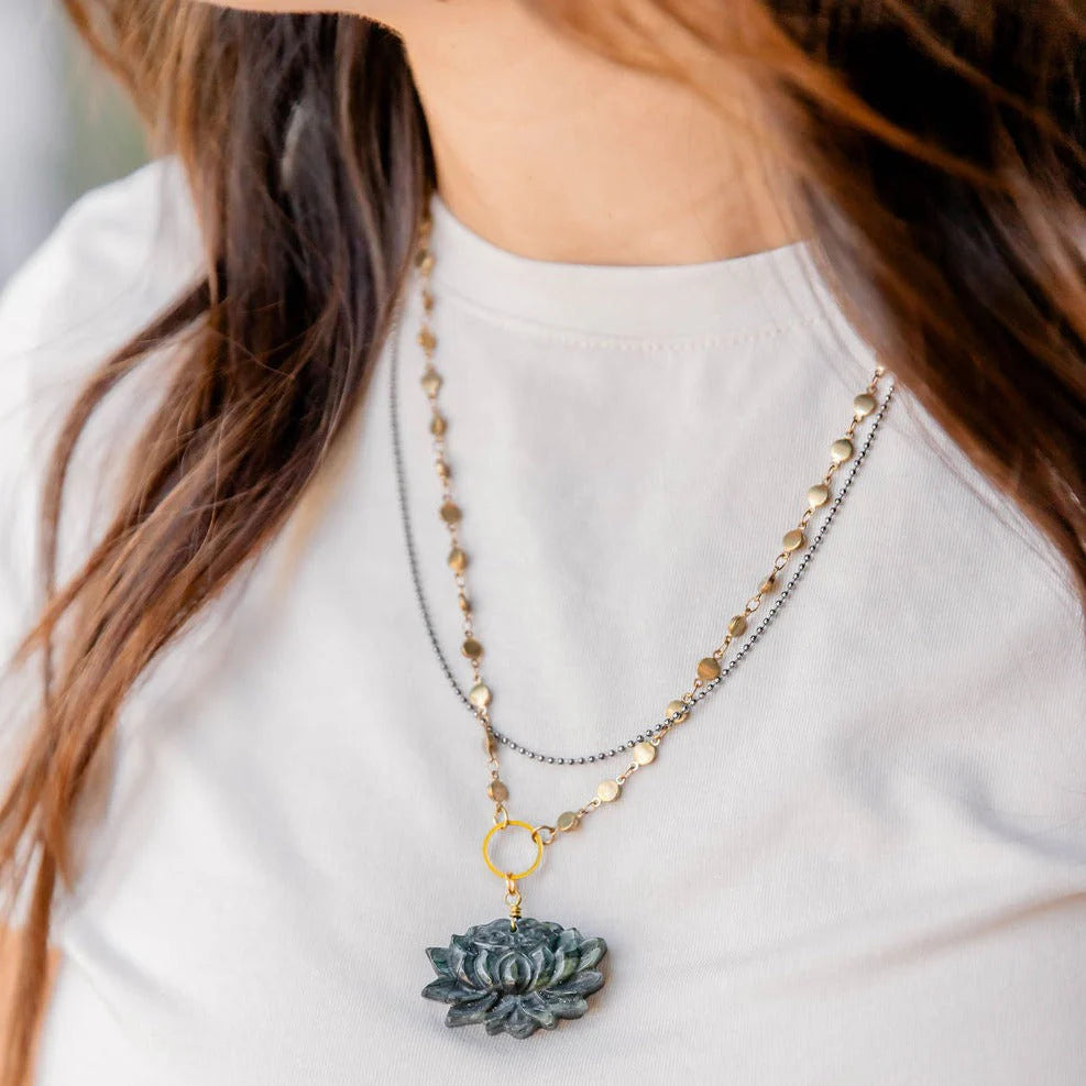 We present this beautiful Gemstone Lotus Necklace, exquisitely carved from labradorite that glimmers with blue-green flashes. It has multiple layers of chain for a bohemian layered look. This casual yet statement piece will make its mark over any outfit - from tee to sweater. The lotus symbolizes strength and determination as it rises from the mud without stains - a reminder of our own strength and beauty.
