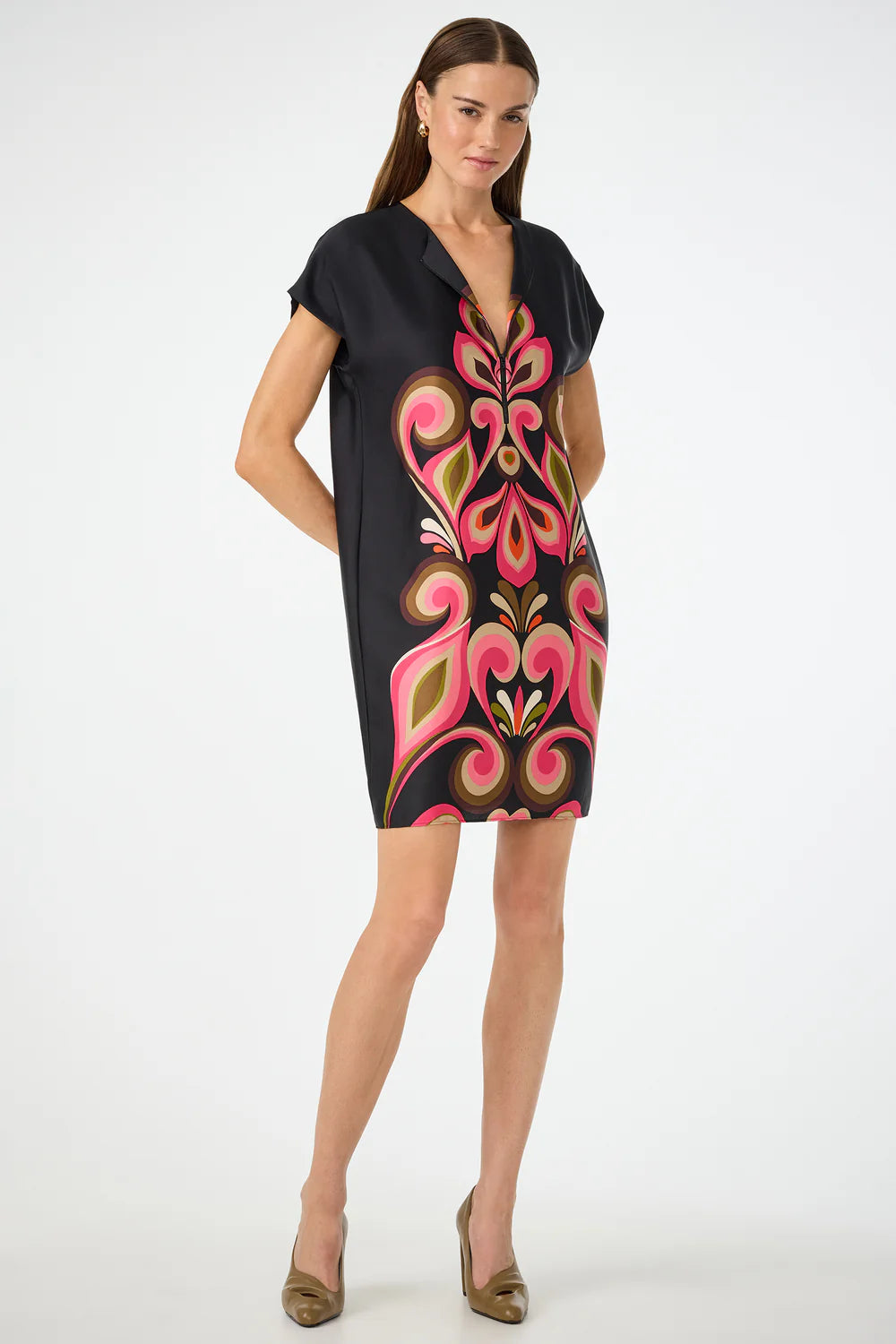 One of our customer favorites, this satin georgette dress features a short sleeve with an extended shoulder, crewneck, fun half-zip front, and beautiful, eye-catching print. Sophisticated and effortlessly sexy, this mini dress is flattering and versatile, making it ideal for your next event - day or night.