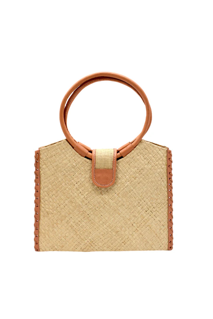 This handbag exudes a boho chic aesthetic, crafted from hand-dyed woven raffia in a luxurious cross weave pattern. Its reinforced shape is accented by oversized leather loop handles and intricate woven leather detailing. The bag features a magnetic snap on its leather and loomed raffia flap closure, as well as solid hue loomed raffia side panels and an interior pocket for added functionality.