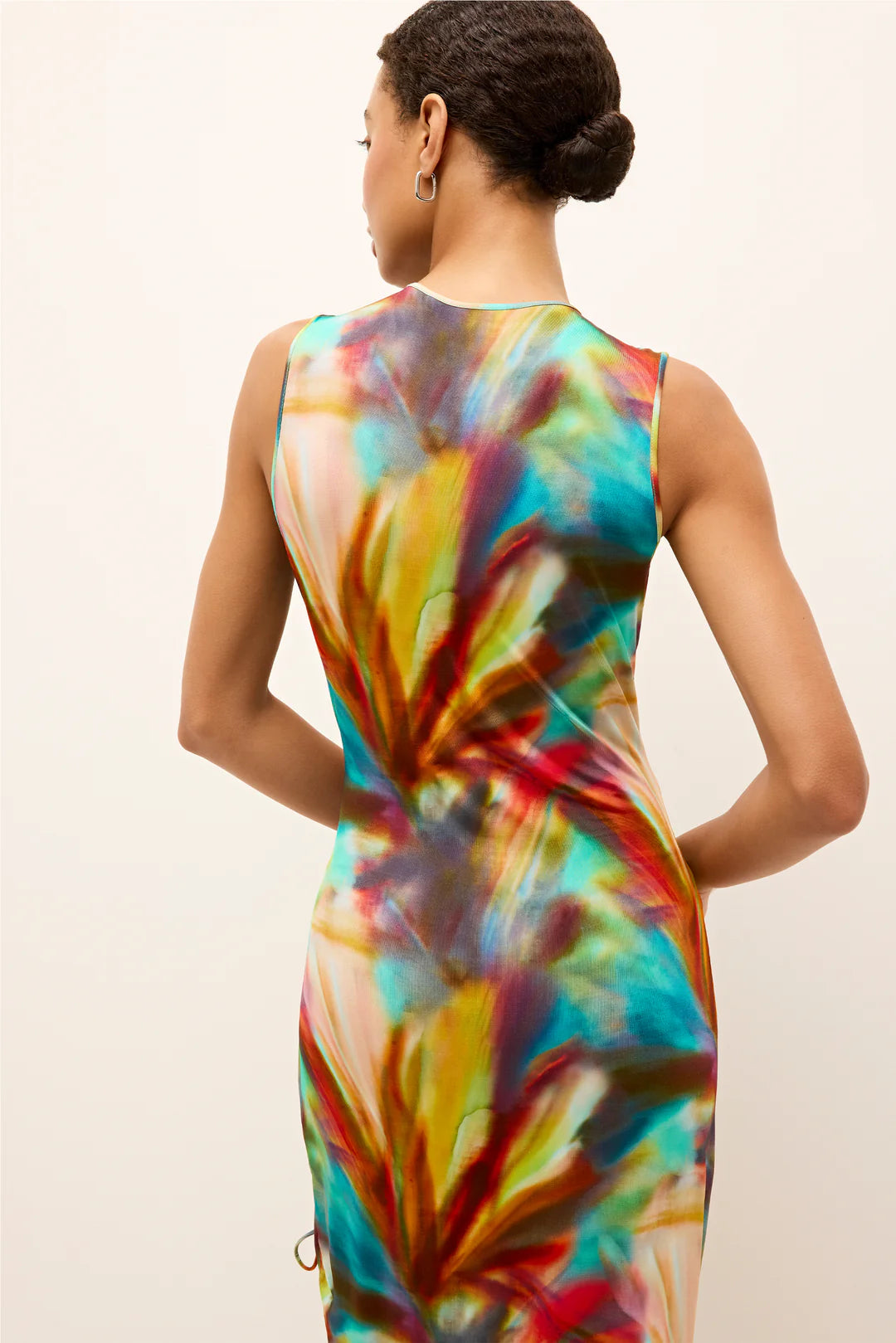 Channeling romantic island vacations, this figure-hugging, date-night midi dress features a side slit with cinchable ties that allow for an adjustable hemline. Ilana is pictured here in Fauna, an abstract blur of colorful palm fronds that feels ripped straight out of paradise.