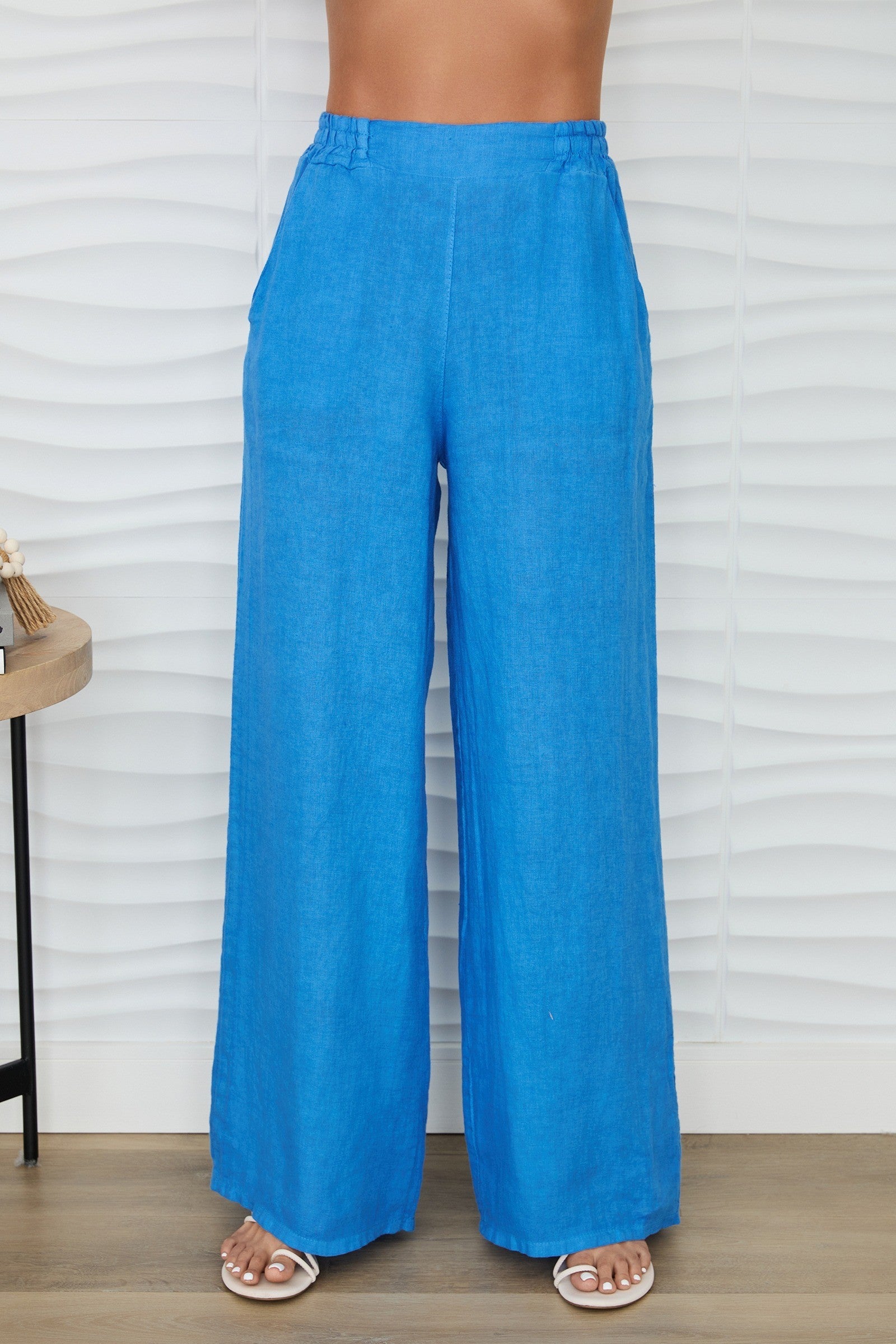 Linen Flat Front Elastic Waist Wide Leg Pant by Milio Milano in Blue Regatta