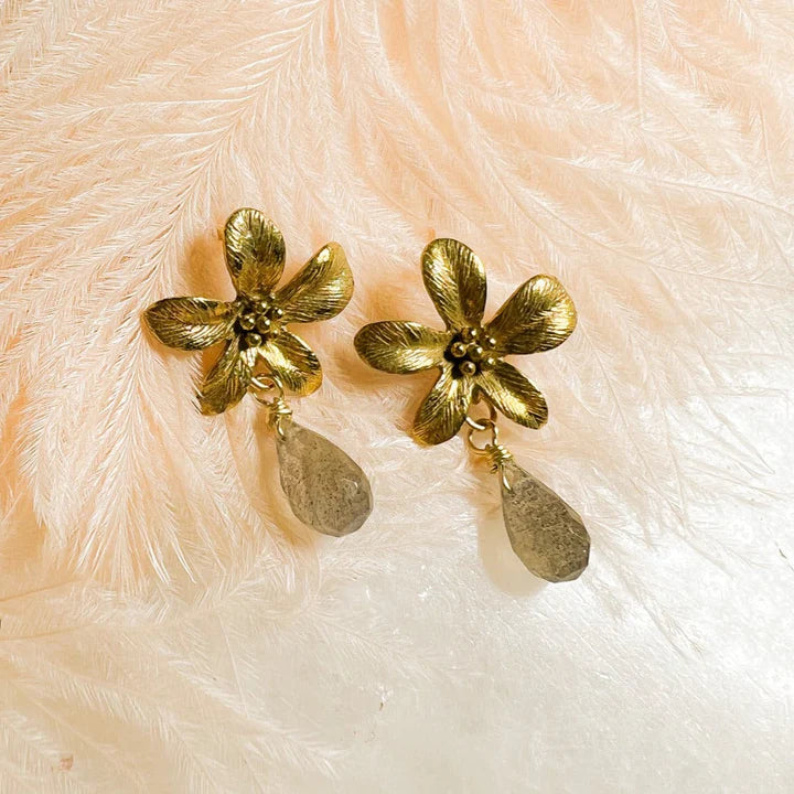 A romantic and sweet flower earring reminiscent of a daisy or cosmo bloom. Hanging off the bottom is a tear drop shaped labradorite gem. Each petal is delicately textured showcasing the beauty and warmth of the jewelers brass used to create these blossom earrings.
