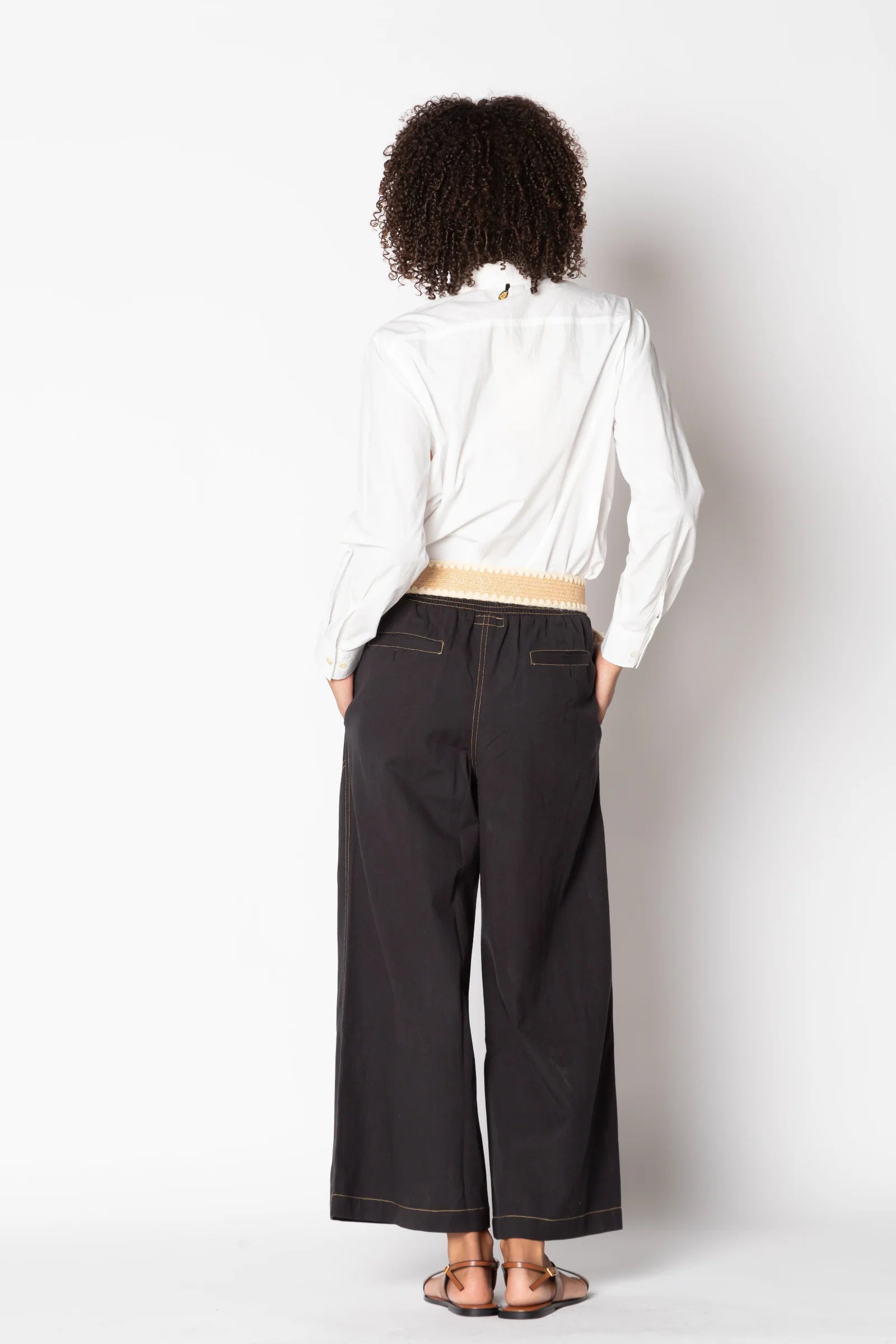 Step into effortless comfort and style with the Ruby Yaya Pula Pant in black. Designed for modern women on the move, these cropped palazzo-style pants feature a 3/4 length wide-leg cut, the flat front waistband creates a clean, tailored look, while the elasticated waistband at the back ensures ease and all-day comfort. Subtle contrast stitching details add a modern edge to the classic black cotton pant