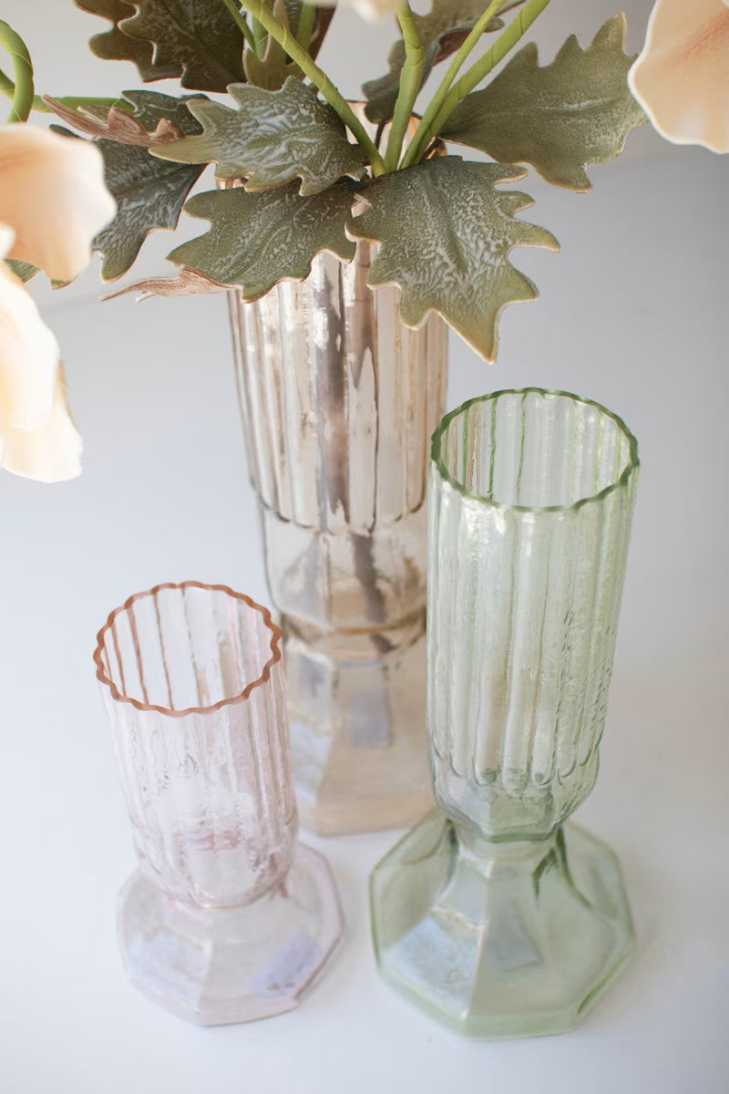 These fluted glass vases come in a set of three with one of each color. Enjoy them full of your favorite blooms or arrange the trio for a pleasing design. Use them anywhere you need a soft touch of color.