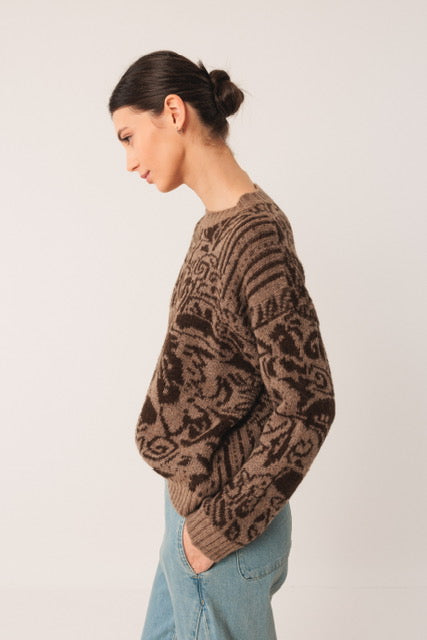 Experience cozy sophistication with the Jacquard Sweater by Indi & Cold in Tobacco. Crafted for comfort and style, its intricate jacquard pattern adds texture and warmth to your wardrobe. This sweater pairs effortlessly with your favorite jeans or tailored pants, making it a versatile choice for both casual and polished looks. Embrace the gentle warmth and timeless design that support your everyday comfort with this thoughtfully made piece.