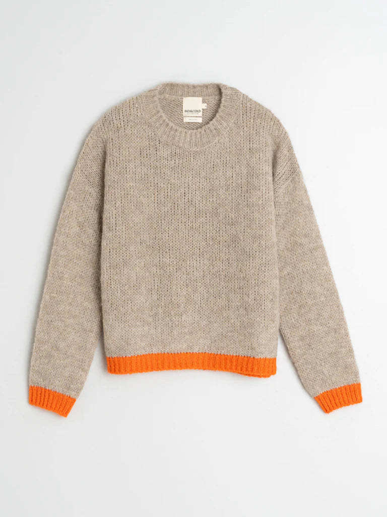 The Bicolor Sweater in Beige Orange from Indi & Cold features an accent color of Orange on the hem and cuffs, with a crew neckline, long sleeves and a slightly slouchy fit. Made in Italy.