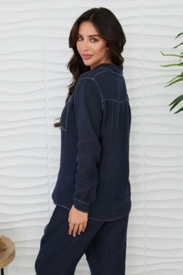 Experience effortless style and comfort with the Linen Long Sleeve Button Down Top by Milio Milano. This top features subtle edge stitch detailing that adds a refined touch to its classic design. Perfect for layering or wearing on its own, its breathable fabric keeps you cool while the tailored fit enhances your silhouette. Elevate your wardrobe with this versatile piece that blends timeless elegance with everyday ease.