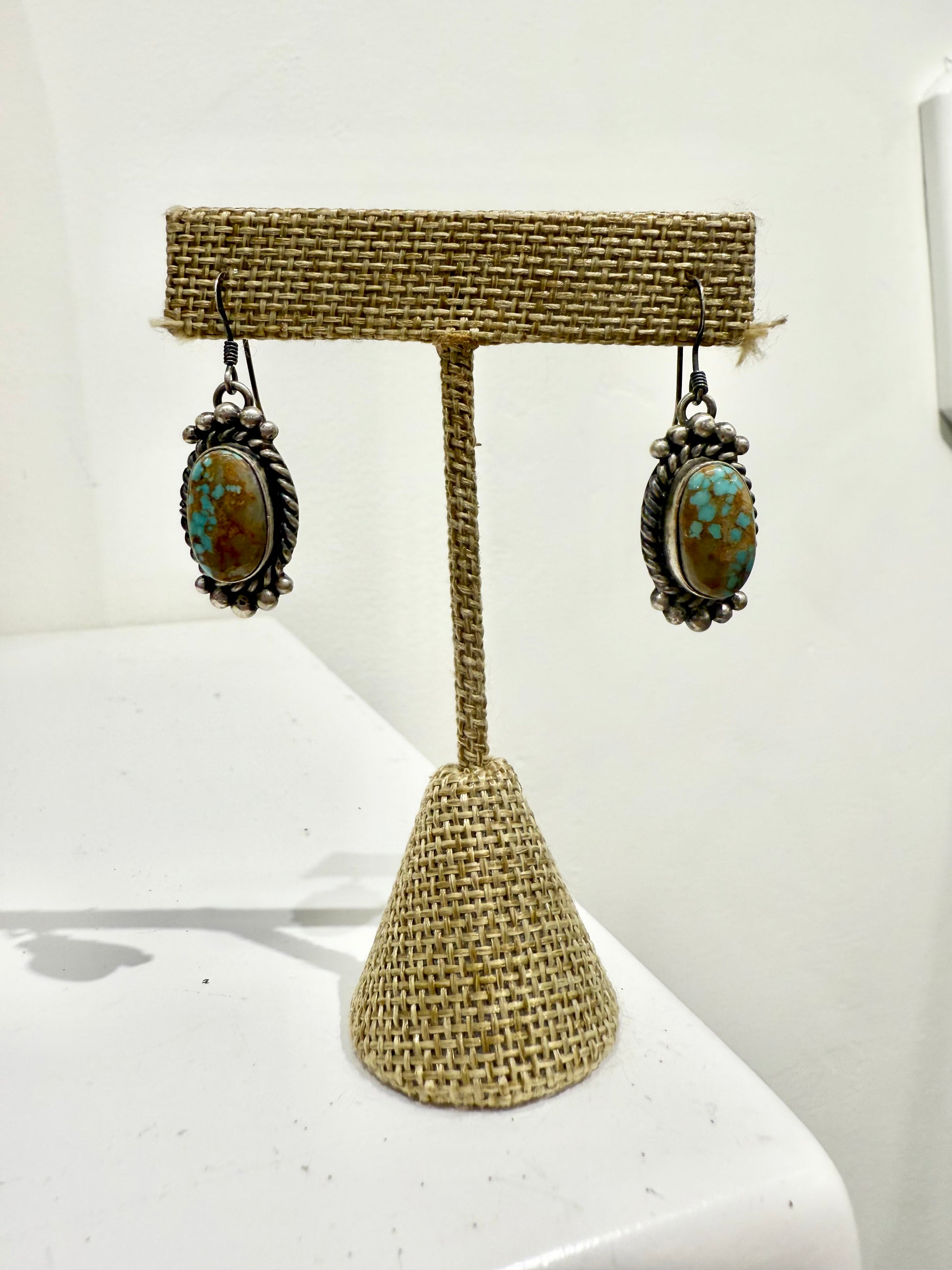 These handmade Native American earrings feature #8 turquoise and sterling silver, creating a unique and eye-catching design. Elevate any outfit with the natural beauty of these Alzuni earrings.