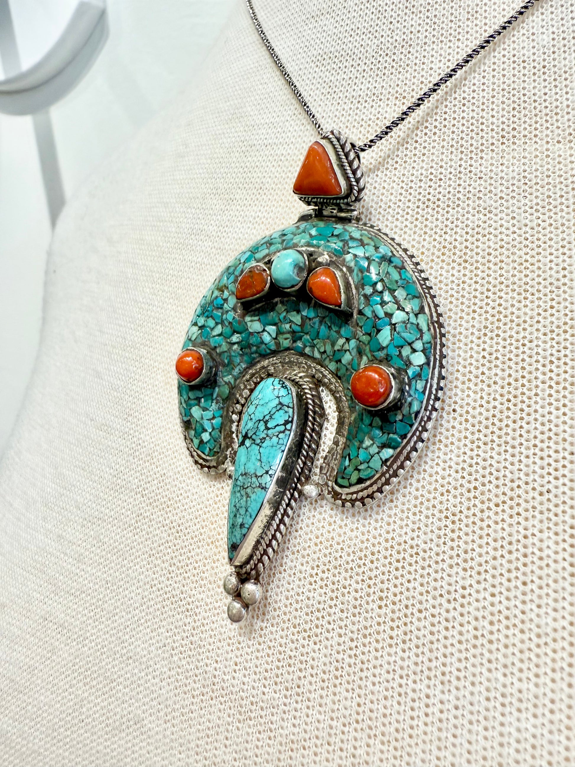 Dazzle with this Vintage Tibetan Turquoise & Coral Pendant Necklace by Everything Tibetan! Add a touch of exotic splendor to any outfit with this unique necklace, handcrafted with authentic turquoise and coral. Unleash your inner adventurer, and turn heads with this one-of-a-kind accessory.