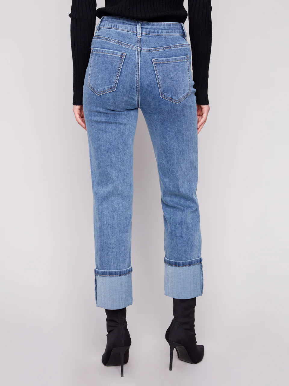 Our Wide Cuff Straight Leg Jeans in medium blue offer a stylish fall look! With a classic regular rise and comfy straight leg fit, these jeans are ideal for all-day wear. The wide cuff detail provides a modern touch, making them incredibly chic. Pair them with your favourite tee or a sophisticated blouse for an outfit that suits any occasion!