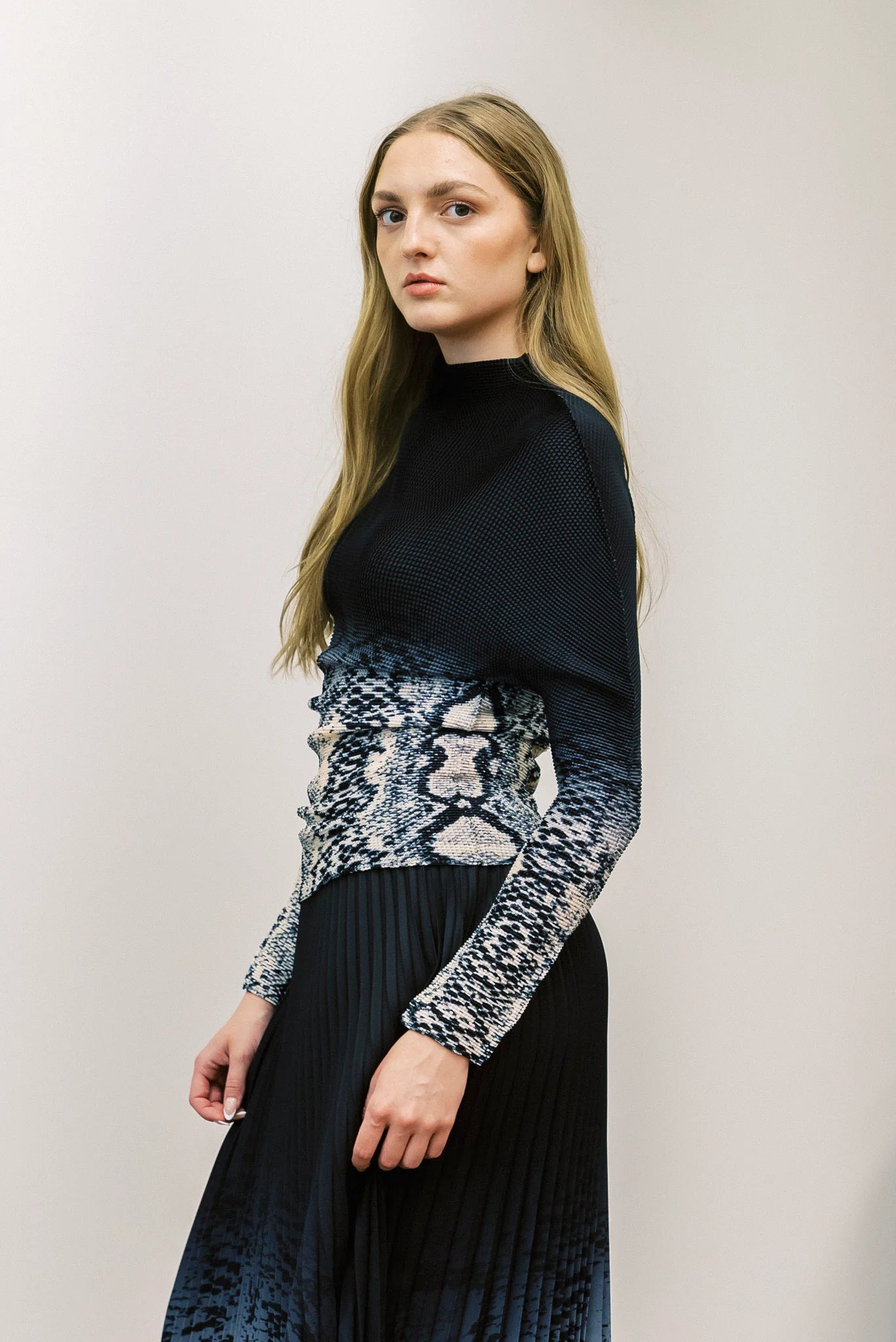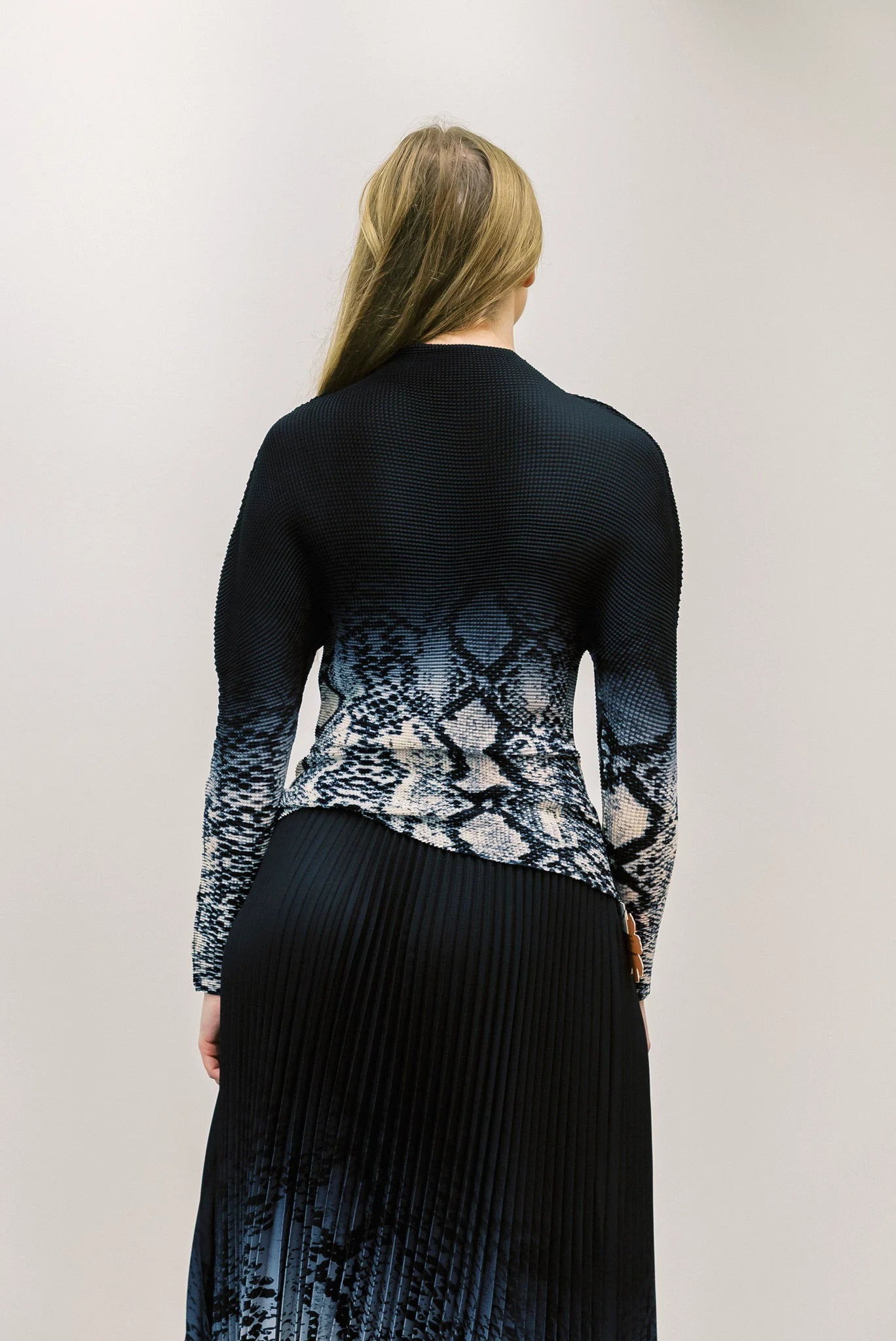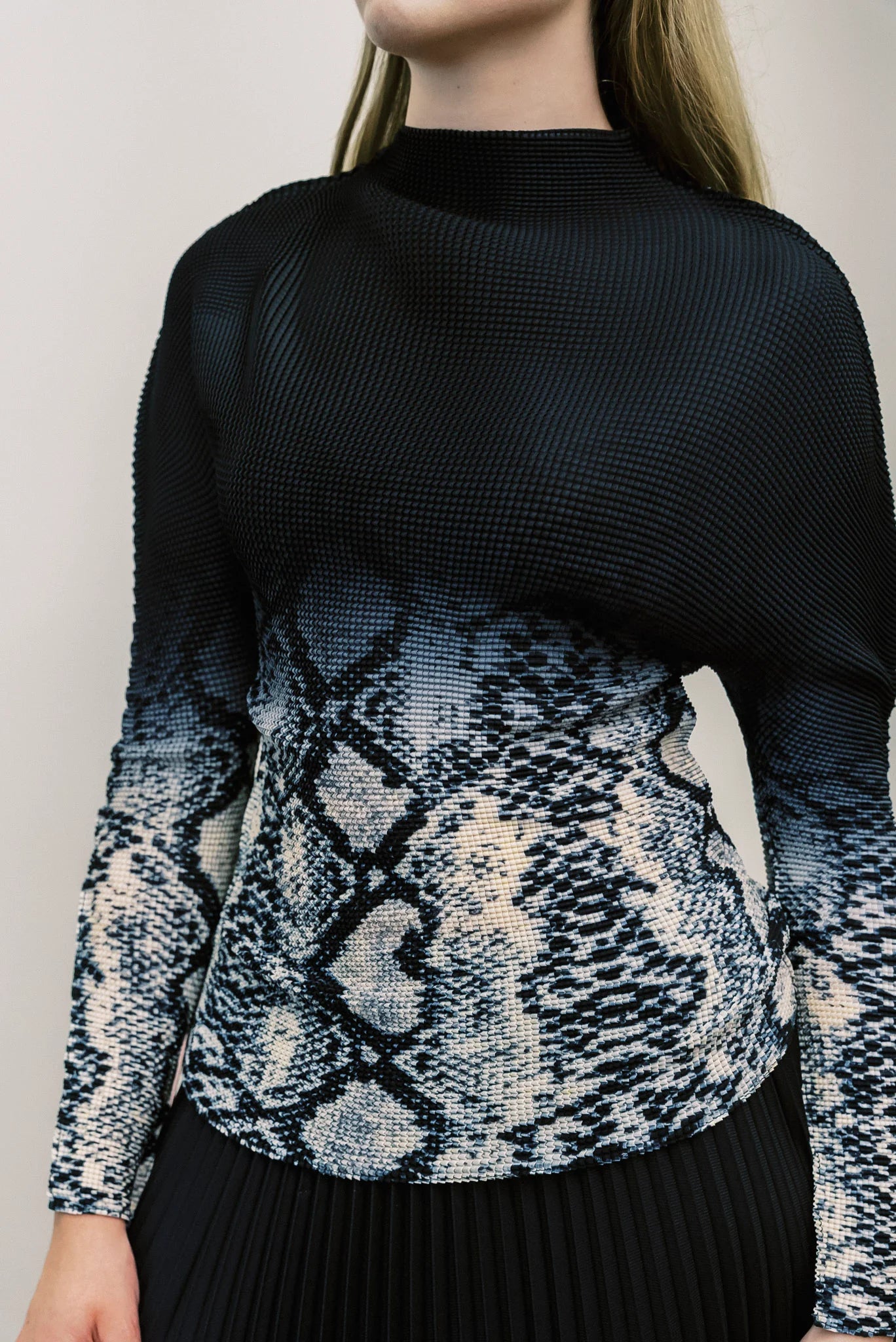 Crafted from lightweight, breathable 100% polyester, the WILD COSMOS Akira Snakeskin Top offers both comfort and style. Featuring a sleek transition from solid black to a dynamic snakeskin pattern, it effortlessly pairs with the Akira Snakeskin Skirt to create a standout, coordinated look. Perfect for those seeking edgy elegance with a comfortable fit.
