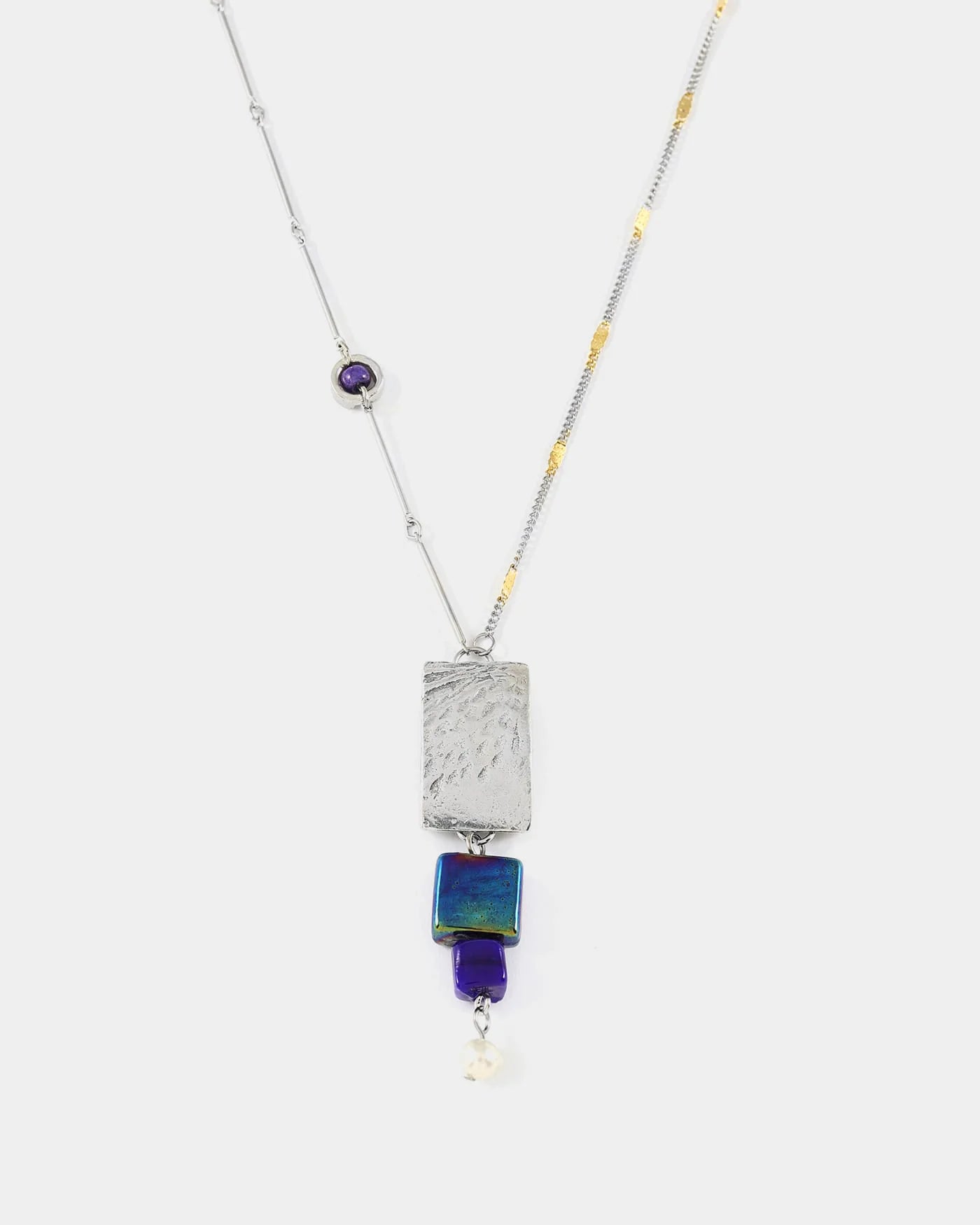The Eris necklace draws a bold vertical line, balancing structure and movement. At its center, a textured fragment of natural or 22K gold-plated pewter anchors a colored glass tassel made of two stacked prisms. A delicate freshwater pearl softens the composition with grace. Higher up on the stainless steel chain, a ringed glass bead adds a discreet, almost secret detail. A structured design that catches the eyeâ€â€Âquietly, but with intention.