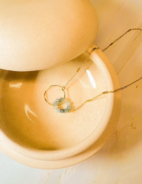 The Double Circle Necklace by Santore Jewelry features two intertwined circles suspended on a delicate labradorite gemstone chain. This elegant design symbolizes connection and balance, while the labradorite adds subtle flashes of color that catch the light beautifully. Perfect for everyday wear or special occasions, this necklace brings meaningful style and a touch of natural beauty to any outfit.