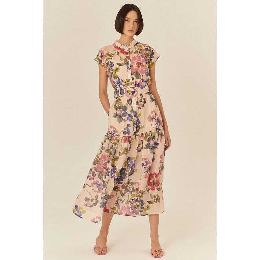 Meet Evelyn  where timeless elegance meets joyful femininity. This graceful midi dress features a soft beige base brought to life with vibrant, colorful florals. The button-up bodice is finished with a dainty collar, adding just the right touch of structure.