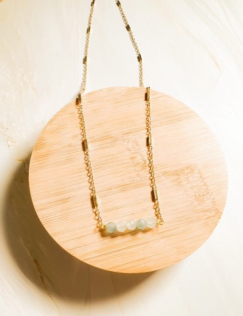 This Gem Gradient Necklace by Santore Jewelry features five beautifully arranged aquamarine stones that create a graceful color transition. Designed to complement any outfit, its balanced gradient offers a subtle yet elegant touch. Perfect for adding a refined sparkle to your look, this necklace highlights the natural beauty of aquamarine while providing a versatile accessory you can wear daily.