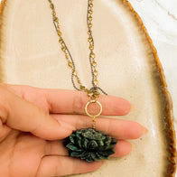 We present this beautiful Gemstone Lotus Necklace, exquisitely carved from labradorite that glimmers with blue-green flashes. It has multiple layers of chain for a bohemian layered look. This casual yet statement piece will make its mark over any outfit - from tee to sweater. The lotus symbolizes strength and determination as it rises from the mud without stains - a reminder of our own strength and beauty.