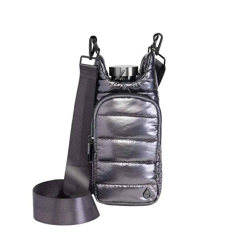 WanderFull's Glossy Hydrobag in Pewter is perfect for hands-free hydration on the go. Its patented design protects your bottle and holds all your essentials with two spacious pockets. The large waterproof pocket fits bottles up to 3.5 inches in diameter, making it a practical and stylish accessory for any occasion. Say goodbye to disposable bottles and stay hydrated in style with this durable and fashionable bag.