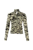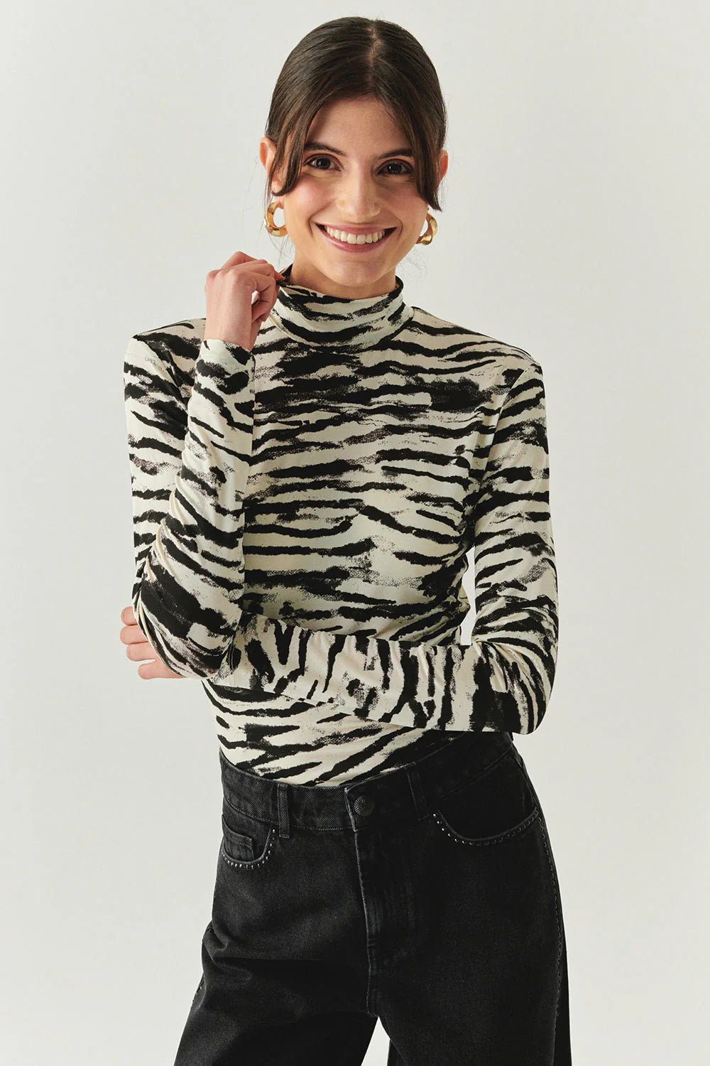 The Laylani Blouse features an animal-inspired print, high neckline, and slim fit through the arms and body. A statement knit that transitions effortlessly from desk to dinner.