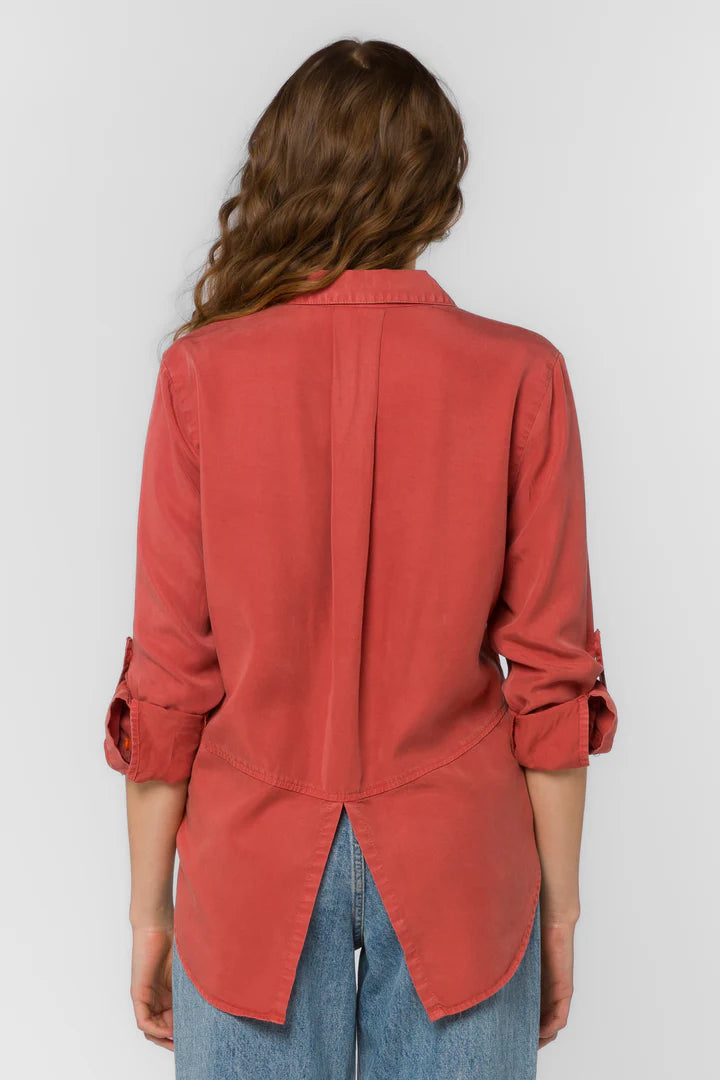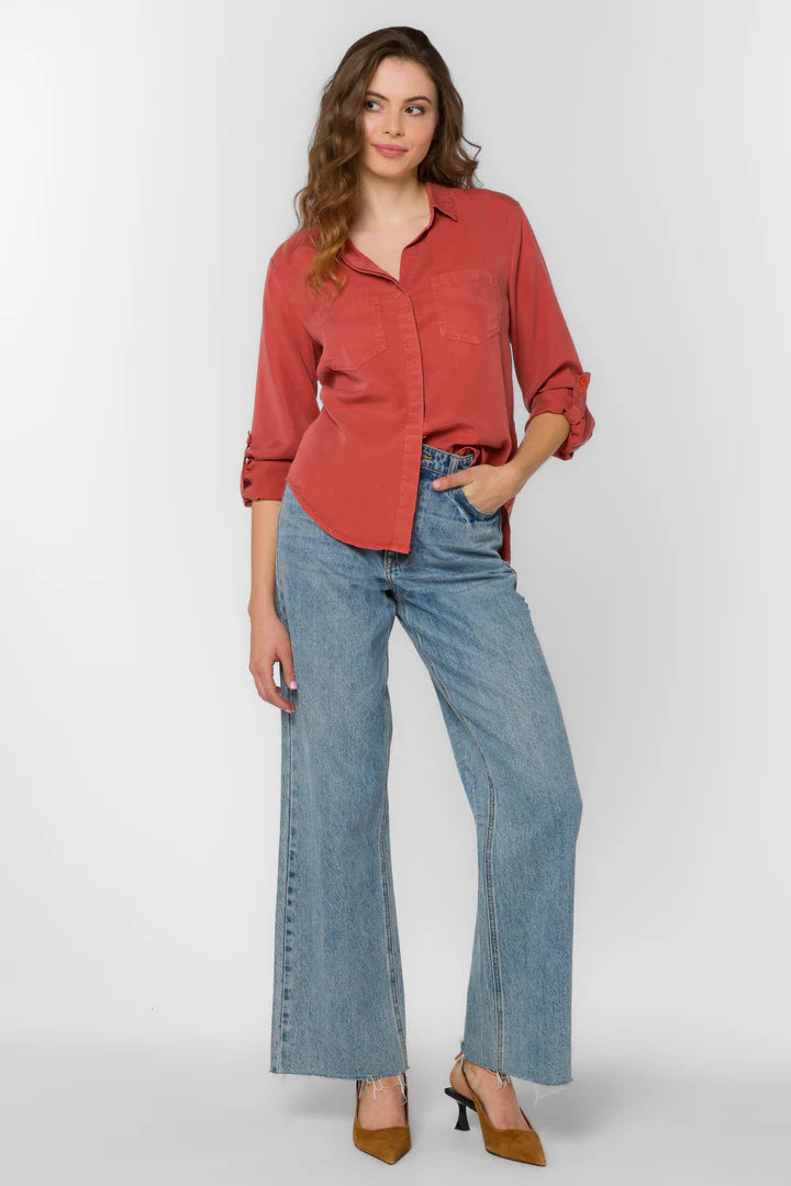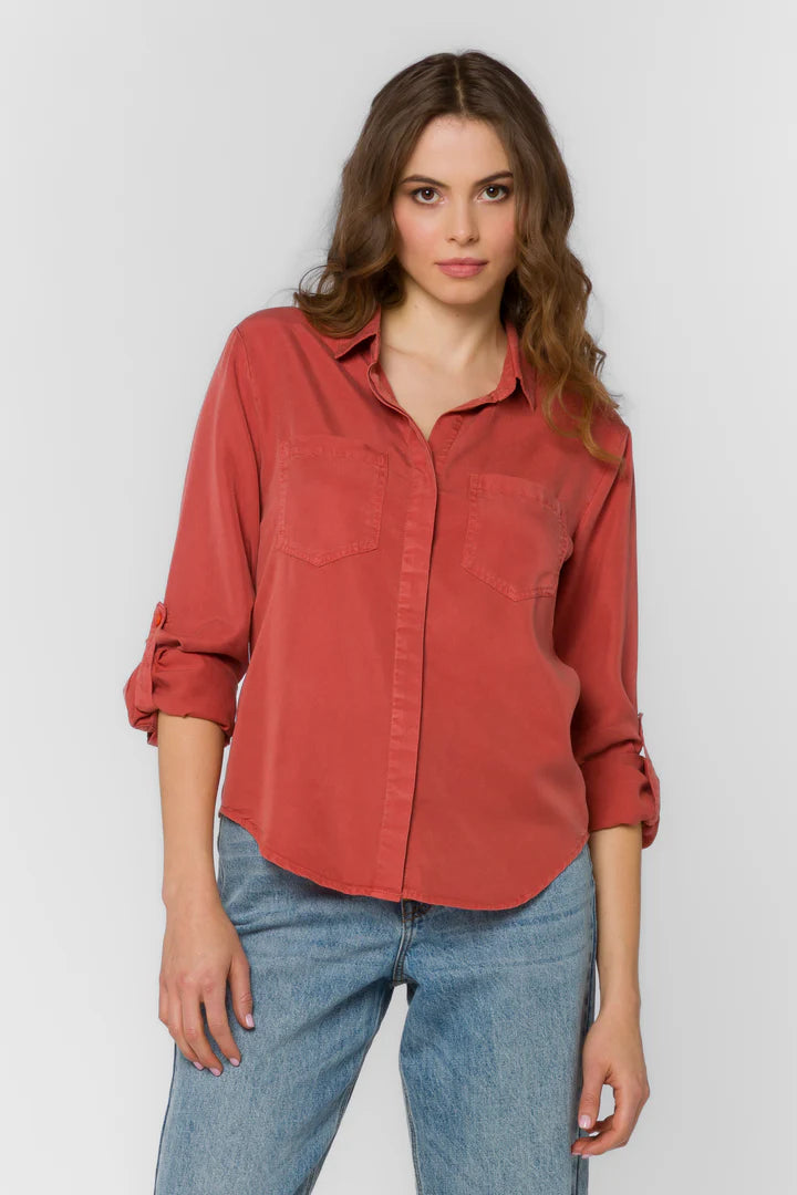 This button up shirt features rolled tab sleeves, chest patch pockets, and a split-back tail and has a silky-smooth, soft feel with a breathable and lightweight drape making it one of our best sellers.