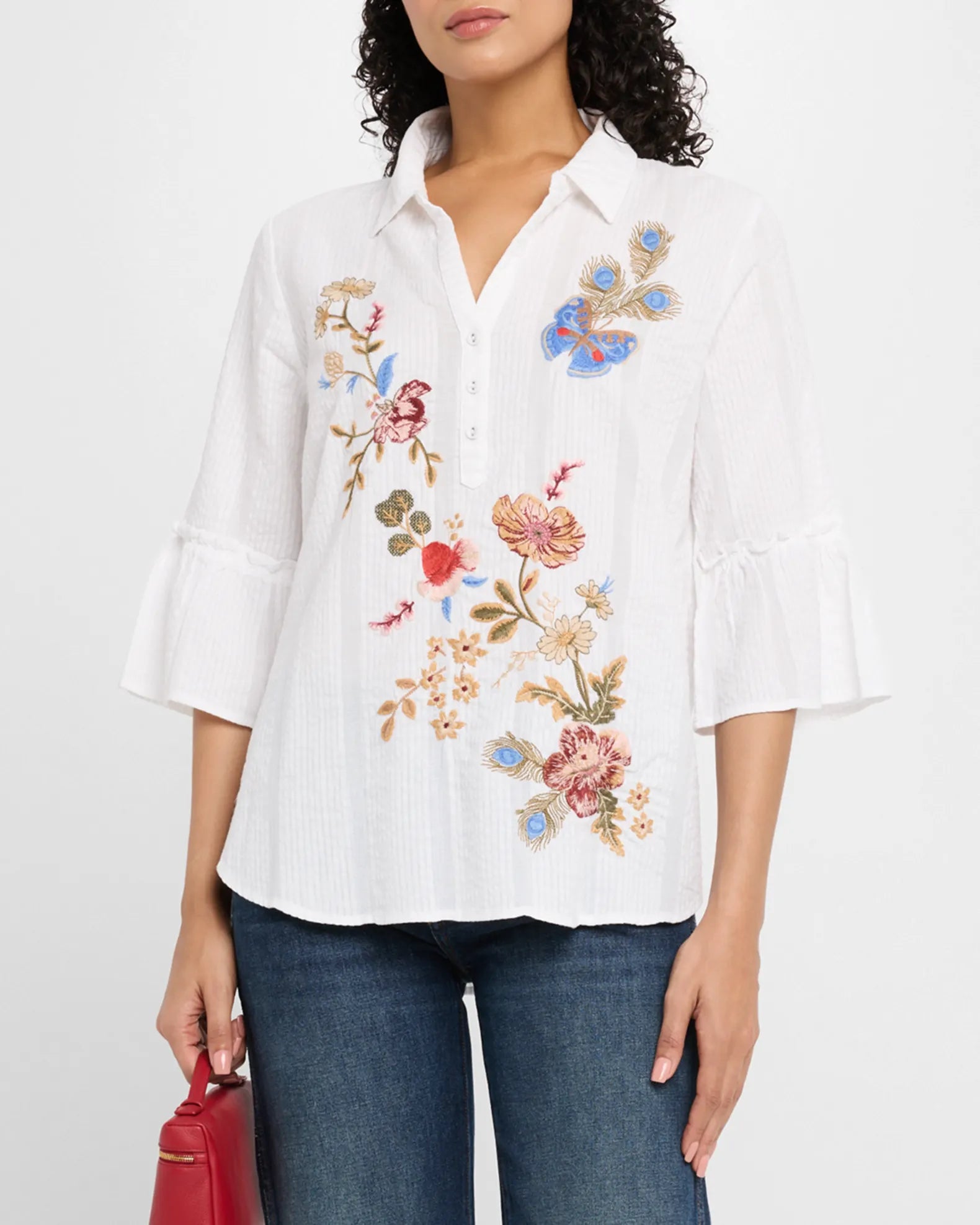- Johnny Was "Florrie" cotton seersucker tunic animated with floral and butterfly embroidery