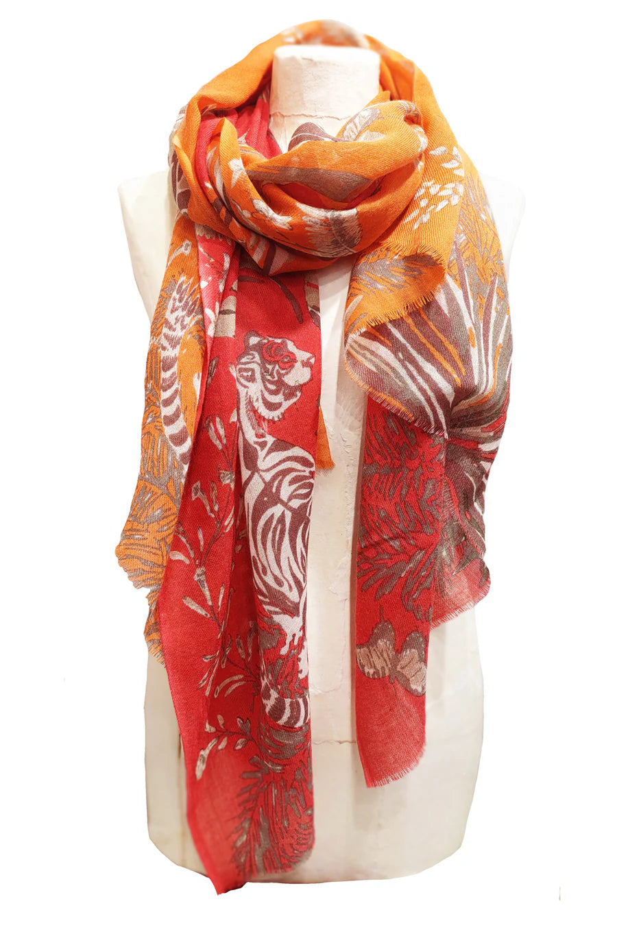 Discover the Safari Wool Stole and its playful tigers and monkeys, which stands out against a neutral and soothing beige background. This ultra-soft Australian wool stole offers a luxurious texture and ultimate comfort. The orange and red details add a subtle touch that attracts the eye and brings a note of freshness to the whole. The pattern of this stole is imagined and designed in France, in Paris. The stole is then made in our workshop in India, using a traditional artisanal screen printing technique. Each step of the process, from design to color application, through the development of fibers and weaving, is carried out with care to obtain an impeccable result. This super soft wool stole is very easy to wear and suitable for any occasion.