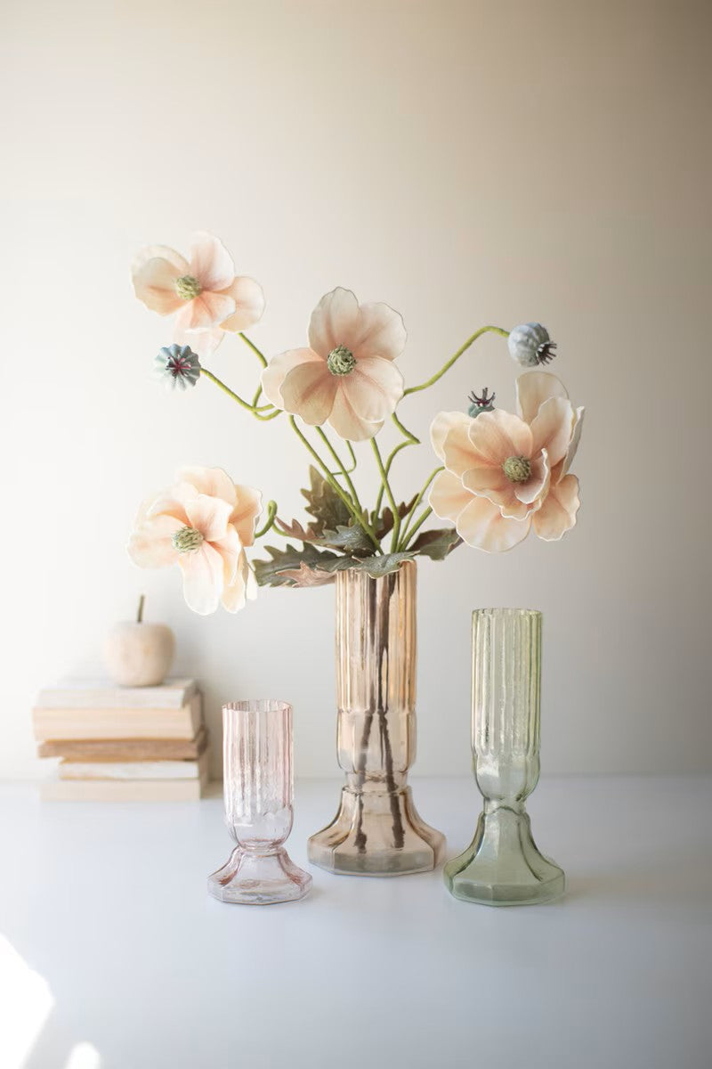 These fluted glass vases come in a set of three with one of each color. Enjoy them full of your favorite blooms or arrange the trio for a pleasing design. Use them anywhere you need a soft touch of color.