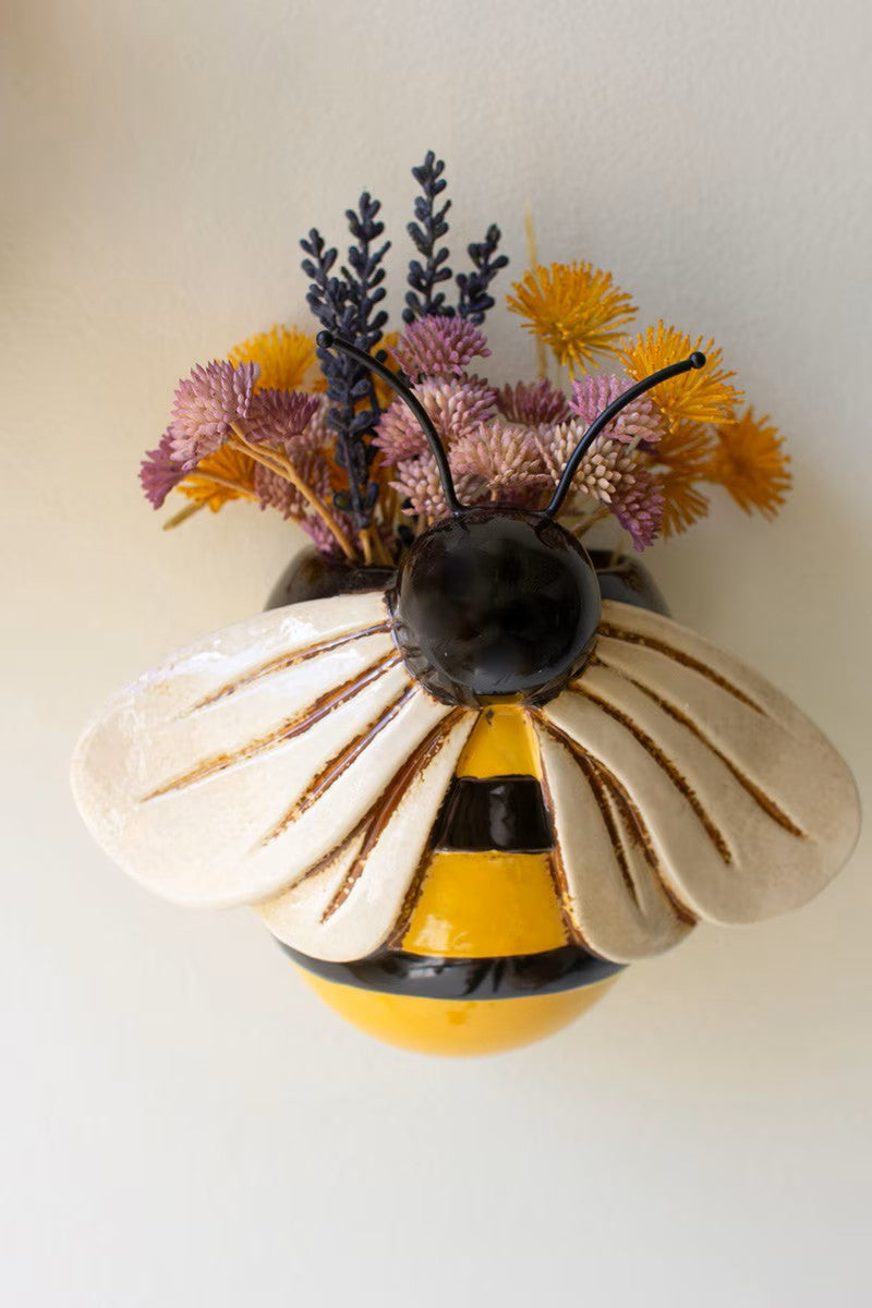 This pair of ceramic bees wall planters is all the buzz. Grow some good out of an empty wall by filling these planters with blooms and buds. You can also try them as catch-all's for small toys in a kid's room. Set includes 2 pieces. One each size. Each has one keyhole hanger.