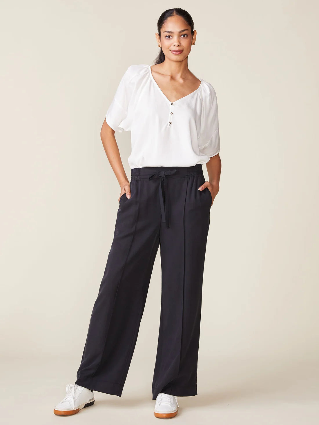Relaxed pintuck pull on pants with pockets crafted in breathable, woven Tencel. A tie front and elastic back gives an air of both polish and ease. These pull ons are day to night, casual to dressy staples. Pair with the You're Magnetic Halter for a stunning and sleek set.