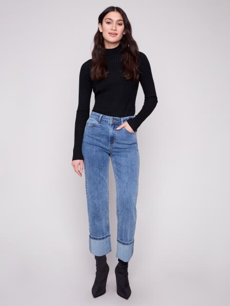 Our Wide Cuff Straight Leg Jeans in medium blue offer a stylish fall look! With a classic regular rise and comfy straight leg fit, these jeans are ideal for all-day wear. The wide cuff detail provides a modern touch, making them incredibly chic. Pair them with your favourite tee or a sophisticated blouse for an outfit that suits any occasion!